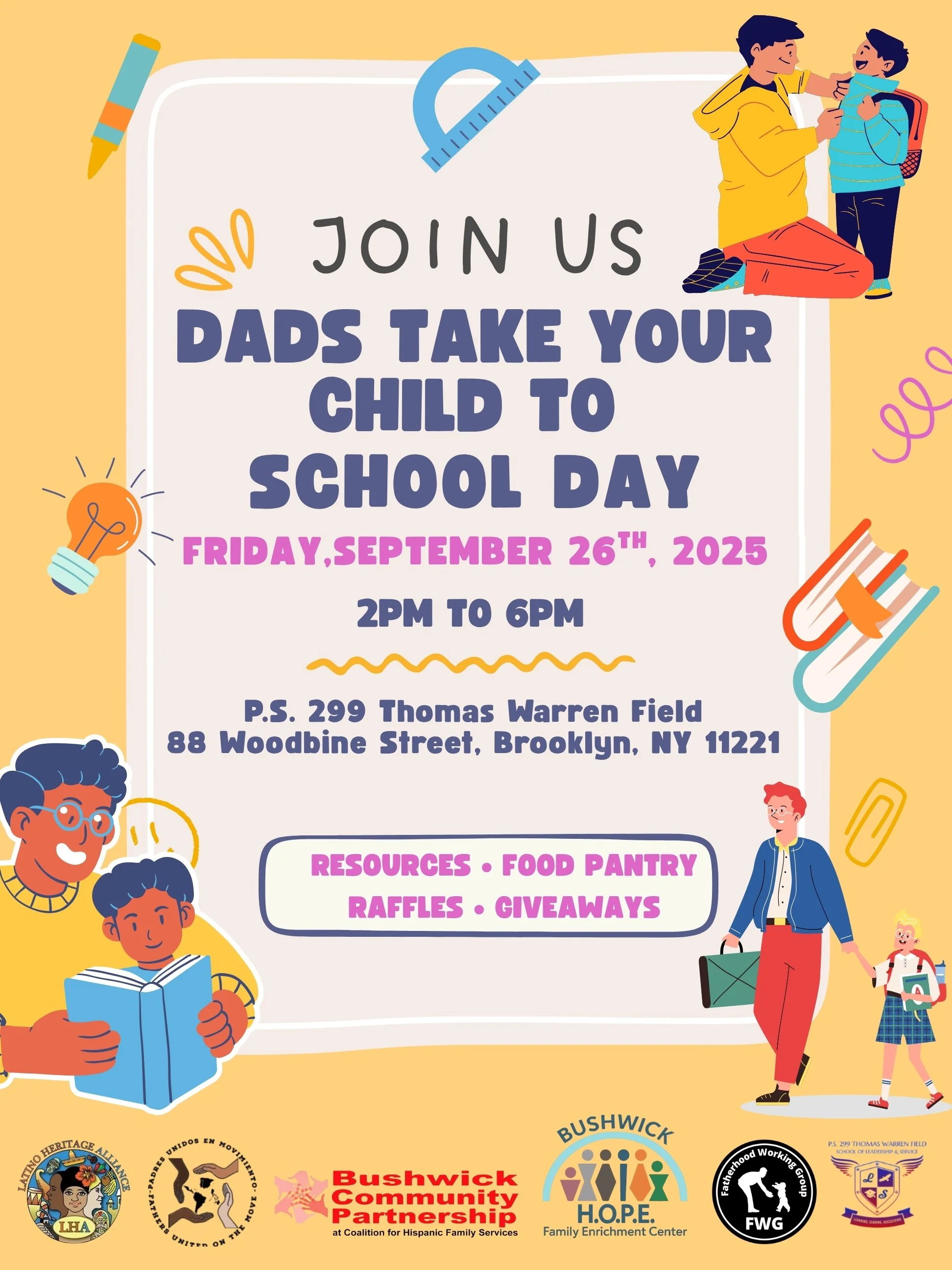 Sep 26 Dads Take Your Child to School Day Friday, September 26, 2025 2:00 PM 6:00 PM P.S. 299 Thomas Warren Field (map) Google Calendar ICS View Event →